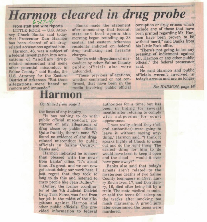 The public’s skepticism is understandable. When U.S. Attorney Chuck Banks held a press conference in June of 1991, to clear Dan Harmon and all other Saline County public officials “of drug-related public misconduct and other forms of wrongdoing,” (Arkansas Gazette, June 28, 1991) I knew Banks was covering up serious crimes, but I didn’t suspect a conspiracy.
