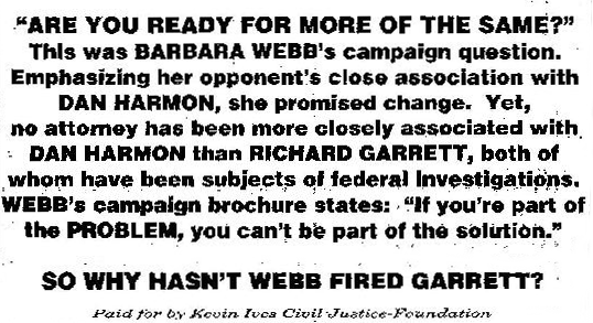 Linda posted this ad in the Benton Courier January 21, 1997 after Webb took the office of district prosecutor. Webb campaigned on the promise to clean up the corruption that was associated with Dan Harmon. Yet she hired Richard Garrett, Dan Harmon’s “yes man,” as deputy prosecutor